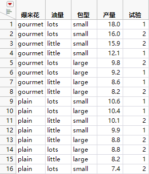1. 选择帮助 > 样本数据库,然后打开 Popcorn.jmp。