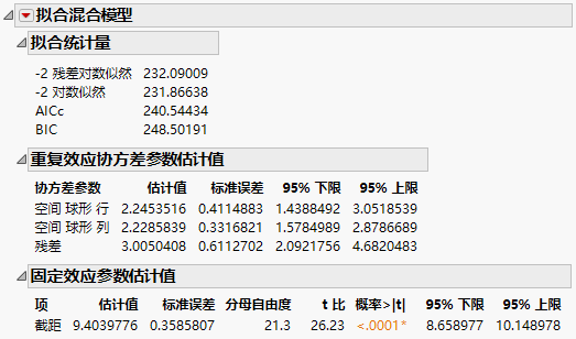 “拟合混合模型”报表显示在“拟合混合模型”报表 - 空间各向异性球形 中。拟合统计量指示该模型的拟合效果没有各向同性(空间结构)球形模型的拟合效果好(AICc 240.54 对比 234.08)。“重复效应协方差参数估计值”报表显示“行”(空间球形行)和“列”(空间球形列)协方差的估计值很接近。没有证据表明网格的行内和列内的空间相关性存在差异。