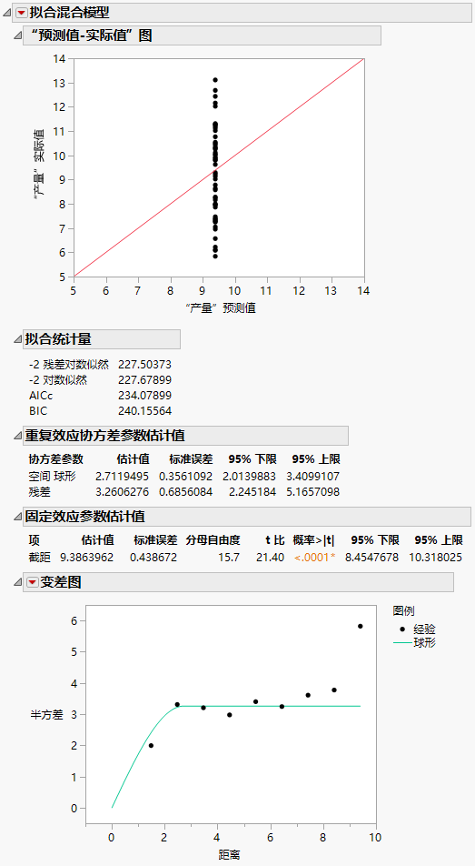 在“拟合混合模型”报表中,“预测值-实际值”图显示预测产量为单个值。这是因为只拟合了空间协方差。“拟合统计量”报表显示“-2 对数似然”为 227.68,“AICc”为 234.08。