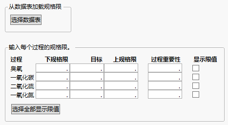 若为过程选择“显示限值”选项,然后将规格限保存到列属性,则将在保存的“规格限”列属性中选定“显示为图形参考线”选项。若为过程选择“显示限值”选项,并将规格限保存到新表中,则新表中的“显示限值”列将为该过程包含 1。使用选择全部显示限值按钮将为所有过程选择“显示限值”选项。