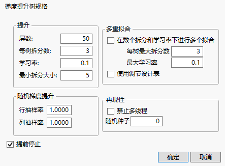 规格窗口在启动窗口中选择确定后,“梯度提升树规格”窗口随即显示。