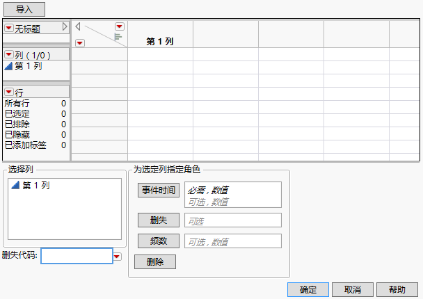 5. 在数据网格下方的面板中,指定哪些列表示“事件时间”数据以及“删失”和“频数”数据(若适用)。