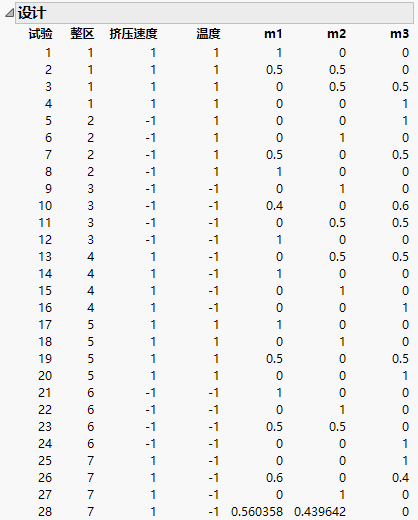 请注意:整区因子挤压速度和温度根据整区因子的水平重置了七次。在整区的每个水平内,混料成分 m1、m2 和 m3 的设置都是随机分配的。