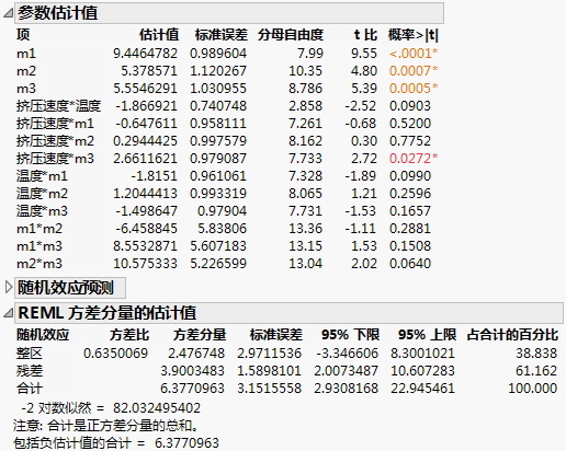 “参数估计值”报表显示:三个混料成分以及挤压速度*m3 交互作用在 0.05 水平下显著。