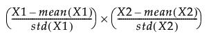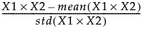 假定您有两个列 X1 和 X2,并且在“拟合模型”窗口中输入交互作用项 X1*X2 作为模型效应。当选定“标准化 X”选项时,在形成交互作用项前已将 X1 和 X2 中心化和统一尺度。形成的交互作用项按以下方式计算:
