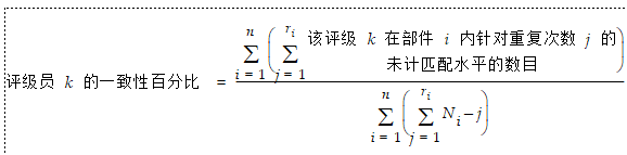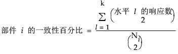 • Ni = m x ri。针对部件 i (i = 1,...,n) 的评级数。其中包含所有评级员的响应,以及针对某部件的重复评级次数。例如,若 3 个评级员每人给部件 i 测量了 3 次,则 Ni 为 3 x 3 = 9。