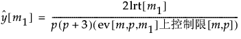 将控制图统计量定义为似然比检验统计量对数的两倍除以 p(p + 3)、除以其近似期望值以及控制限的近似值。因为除以上控制限的近似值,因此可以针对上控制限 1 标绘控制图统计量。按以下方式给出近似控制图统计量: