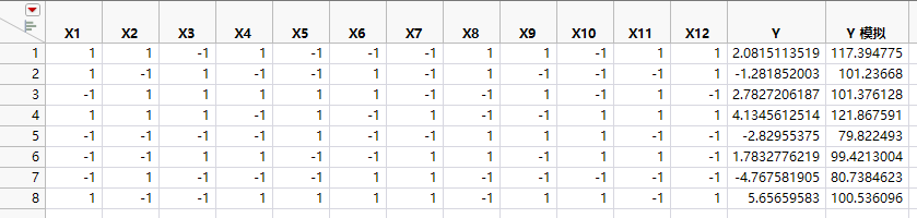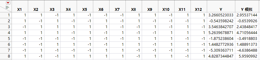 注意:响应值随机生成。您的值不会与X1 和 X11 活跃时的 Y 模拟响应列 中的值精确匹配。