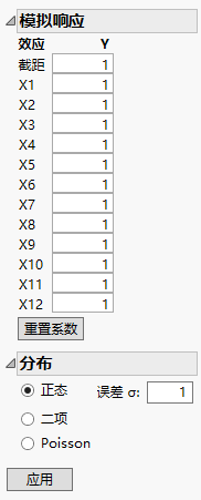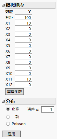 “模拟响应”窗口显示所有项的默认系数均为 1,分布选择为“正态”,“误差 s”为 1。Y 和 Y 模拟列中的值当前仅反映随机变异。
