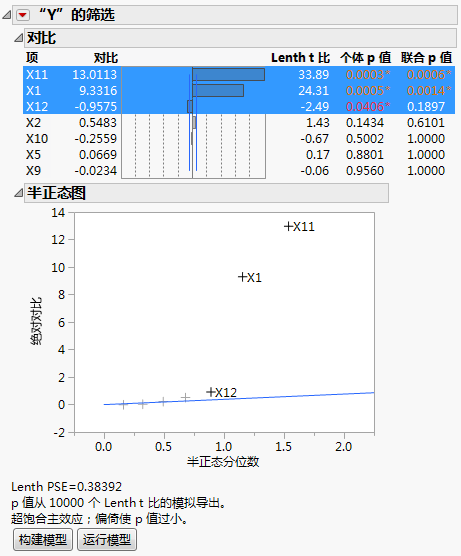 因子 X1 和 X11 具有较大的对比以及 Lenth t 比值。此外,这两个因子的“联合 p 值”较小。在半正态图中,X1 和 X11 均落在距离线条较远的位置。“对比”报表和“半正态图”报表指示 X1 和 X11 是活跃的。尽管 X12 的“个体 p 值”小于 0.05,但其效应比 X1 和 X11 的效应小得多。