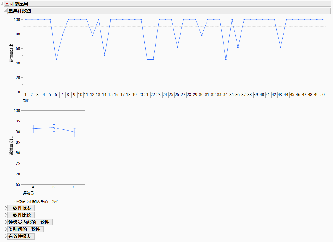 计数量具图标绘“一致性百分比”,该百分比用来测量研究中每个部件对应的评级员一致性程度。每个部件的一致性是通过将每对评级员对该部件的评级与该部件的全部评级加以比较而计算得出的。请参见计数量具图的统计详细信息。