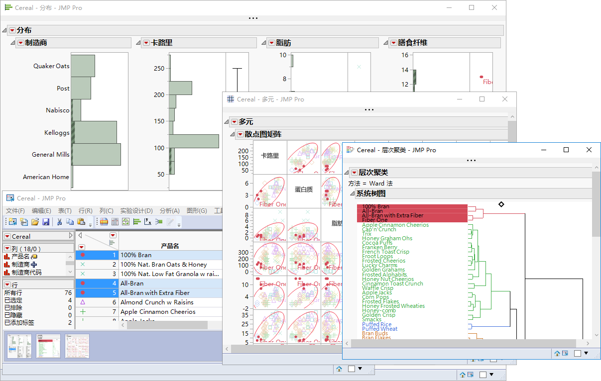 本章对随 JMP 安装的 Cereal.jmp 样本数据表进行了逐步分析。您将学习如何在“分布”、“多元”和“层次聚类”等平台中探索数据。
