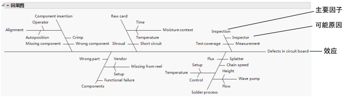 在因果图 中作为效应(也称问题)的 Defects in circuit board 显示在右侧的中心线。主要贡献因子显示在分支末尾(Inspection、Solder process、Raw Card 等)。可能原因显示为每个主要因子的分支。