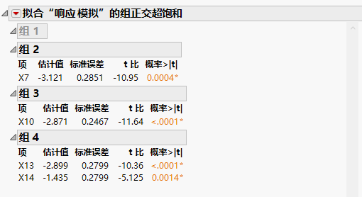 “拟合组正交超饱和”报表具有两部分。第一部分报告每个组中活跃效应的估计值,一次拟合一个组。仅显示活跃组。这是分析的“阶段 1”。在“阶段 2”中构造组合模型。