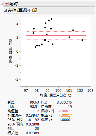 “配对”报表显示一个 Tukey 均值-差值图、汇总统计量和配对 t 检验的结果。请参见差值图和报表。若指定了 X,分组变量,该报表还会包含“组间”报表。请参见组间。