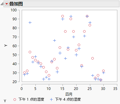 该平台最初叠加所有指定的 Y 列。图下方的图例显示标识每个 Y 列的各个标记和颜色。有关该图的附加选项的信息,请参见