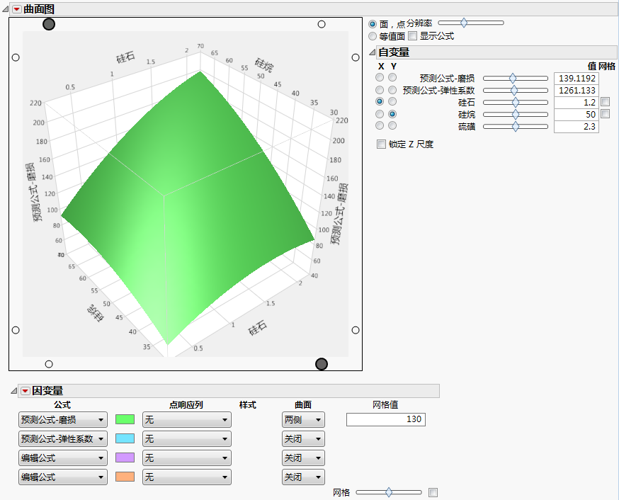 初始“曲面图”报表显示曲面图、外观控件、自变量控件和因变量控件。若指定了不止一个预测公式列,则在初始报表中仅显示第一个曲面。不过,若指定了不止一个观测的响应列,则所有点都显示在初始报表中。