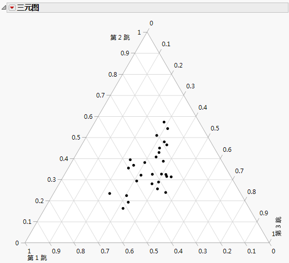 三元图的每条边表示比例为 0%,三角形中与底边相对的点表示比例为 100%。当任意一个样本中的比例增加时,表示该样本的点将从底边移到三角形的相对点。