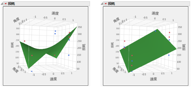 三因子完全析因设计的模型拟合 - 左图为材料 A,右图为材料 B 中的“曲面刻画器”图根据两个连续效应速度和角度显示了损耗的预测响应。左图显示材料为 A 时的预测响应;右图显示材料为 B 时的预测响应。材料为 A 时对应的点显示为红色,材料为 B 时对应的点显示为蓝色。响应曲面形式在材料各水平之间的差异是三因子交互作用的结果。