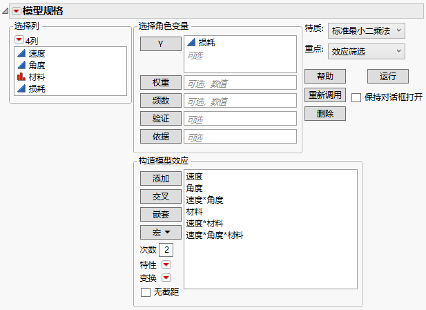 4. 在“选择列”列表中,选择速度、角度和材料。