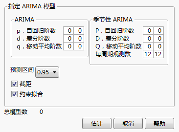 显示“ARIMA 模型组”窗口,您可以在其中通过指定阶数范围来拟合各种 ARIMA 或季节性 ARIMA 模型。您将范围输入窗口时,相应更新“总模型数”。