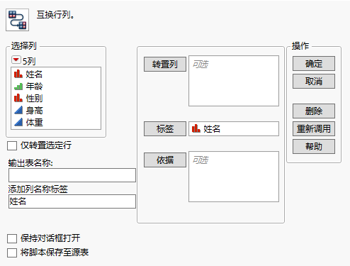 原始表有多列且包含一个标签列 | JMP 会在“转置”窗口显示时将标签列自动插入标签框。若不希望显示该列,可以将它删除。 |