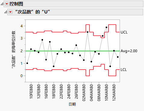 Quality Control 样本数据文件夹中的 Braces.jmp 数据记录了盒装车用支架的缺陷计数。每盒支架都是一个检查单位。每天检查的盒数是子组样本大小,该大小是可变的。U 图 中的 U 图监控的是每个子组样本大小的支架缺陷数。上下边界根据检查的单位数而变化。
