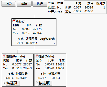 在图形下方是控制按钮:拆分、剪除和执行。仅当存在验证集时才显示“执行”按钮。除此之外,还显示了“处理”列的名称及其两个水平,称之为“处理1”和“处理2”。若“处理”列包含两个以上的水平,除了将第一个水平视为单独的水平外,其他所有水平统一合并为“处理2”。