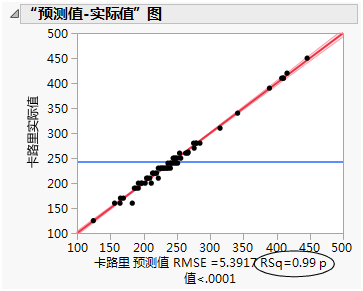 模型准确度的另一个测度是 R 方值(显示在“预测值-实际值”图 中图形的下方)。R 方值测量该模型中解释的卡路里变异性的百分比。值越接近 1 表示模型预测效果越好。在该示例中,R 方值为 0.99。