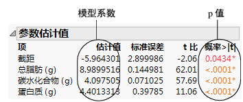 在该示例中,p 值都非常小 (<.0001)。这表示所有三个效应(脂肪、碳水化合和蛋白质)在预测卡路里时都做出显著贡献。