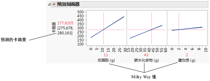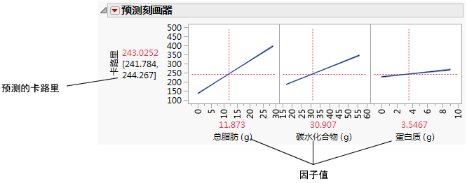 使用“预测刻画器”可以查看因子的变化如何影响预测值。刻画线显示随因子变化卡路里的变化量。代表总脂肪 (g) 的线条最陡,表示总脂肪变化对卡路里的影响最大。