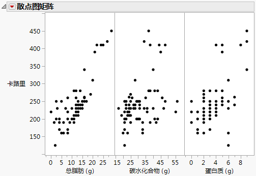 散点图矩阵显示卡路里与这三个变量之间存在正相关性。卡路里和总脂肪之间的相关性最强。既然营养学家认识到存在关系,则可以构建多重回归模型以预测平均卡路里。