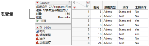 表变量可以包含文本信息(例如,数据的源信息),或者包含可供列公式或 JSL 脚本使用的值。表变量名显示在数据网格左侧的表面板中。