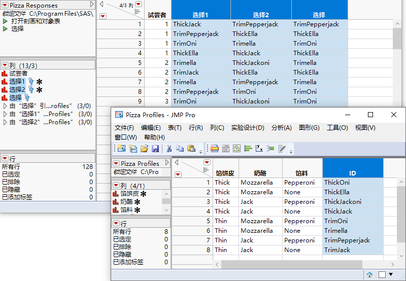 虚拟连接的数据表 显示虚拟连接的数据表的一个示例。Pizza Profiles.jmp 是被引用的数据表,因为 ID 列包含一个“链接 ID”列属性。该 ID 列包含对应于引用数据表 Pizza Responses.jmp 中数据的唯一值。