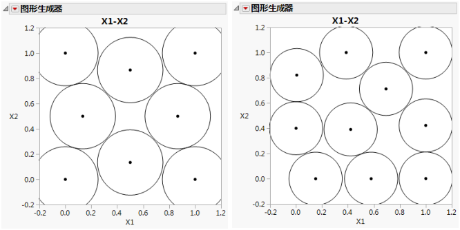 其中 0.518 是您在“设计诊断”面板中记下的最小距离值。该脚本绘制一个以每个设计点为圆心的圆,其半径为 0.259(直径 0.518 的一半),如具有 8 次试验(左侧)和 10 次试验(右侧)的球堆积示例 中的左侧所示。该图显示 JMP 堆积设计点的有效方式。