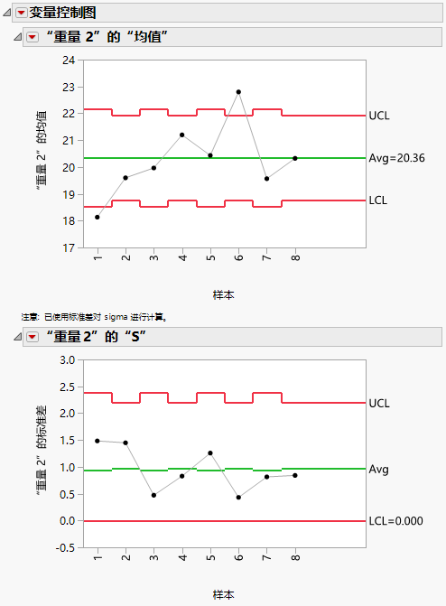 重量 2 的数据中有若干缺失值,所以您可能会注意到图中有不规则的限值。尽管每个样本的观测数相同,但样本 1、3、5、7 均包含缺失值。