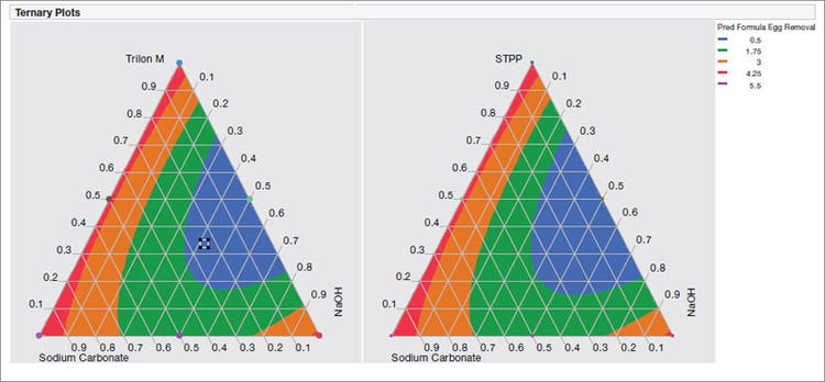 “我们设计了一种测试方法可以指示配方之间的差异。”Dailey表示 “然后我们进行了三水平混合设计并使用 JMP 非常有效地对该空间进行了建模。 在这种情况下我们研究了络合剂、聚合体和助洗剂的组合。” 洗洁精中的络合剂可以中和水里阻碍清洗过程的金属。