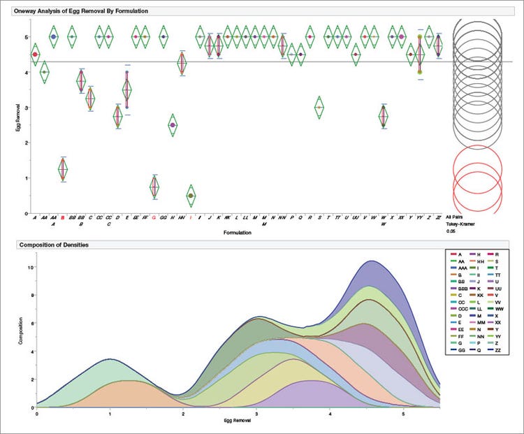 单因子方差分析图显示所评估的不同配方的除卵能力存在显着差异。
