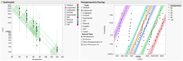 Bergès 使用 JMP Pro 的 “以X拟合寿命” 进行不同温度下的高功率可靠性评估(HPRA) 对比测试。