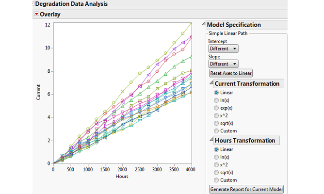 针对特定客户要求的 4000 小时试验,恩智浦六西格玛实践者们还使用 JMP Pro 的退化分析功能对通过一个典型的 2000 小时测试获得的高温工作寿命(HTOL)试验结果(汽车行业标准)进行建模和预测。