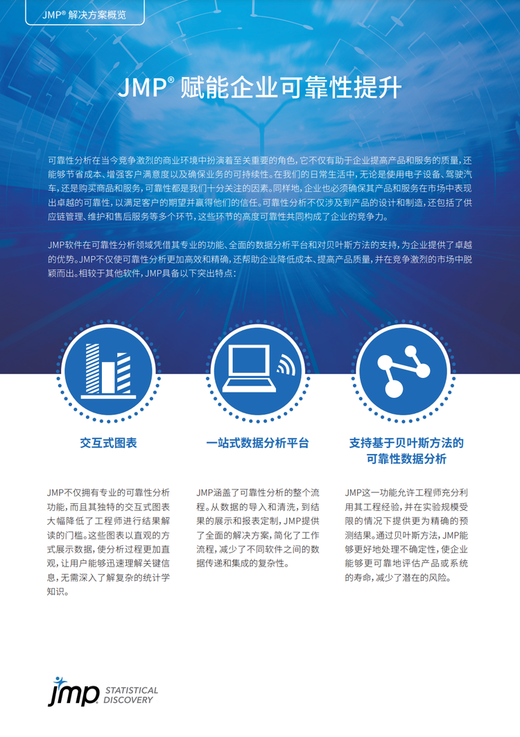 JMP软件在可靠性分析领域凭借其专业的功能、全面的数据分析平台和贝叶斯方法的支持,为企业提供了卓越的优势。JMP不仅使可靠性分析更加高效和精确,还帮助企业降低成本、提高产品质量,并在竞争激烈的市场中脱颖而出。