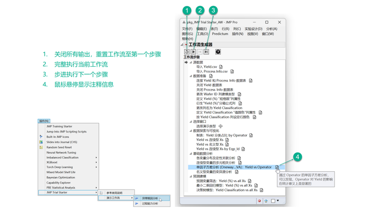 两个演示工作流均基于 JMP 用于记录数据分析步骤的“工作流生成器(Workflow Builder)”工具创建,这也是 JMP 分享洞察的 一种方式,其使用方法极其简单,您可以参考以下图示的主要功能说明,也可以参考网页顶部的 配套短视频演示效果,就像使用其他媒体播放器一样使用他们。此处仅以“异 常根因分析演示工作流”为例,其他工作流使用方式均相同。