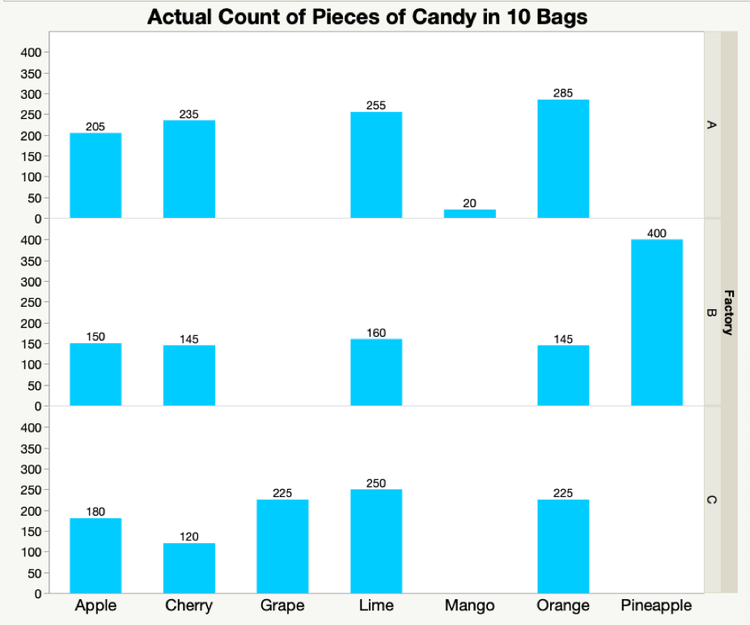 如果数据有多个分组,在一个条形图中将所有数据一起绘制出来有助于显示这些分组中的模式。图 11 合并了来自 3 个糖果工厂的数据。