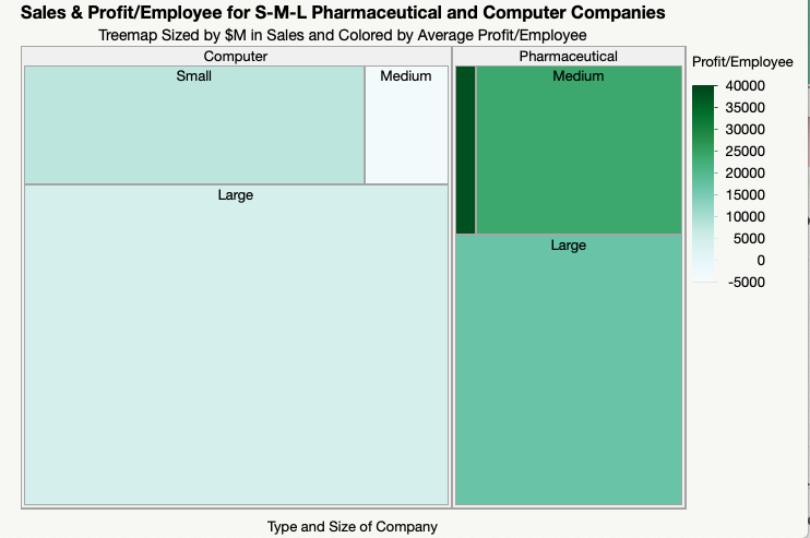 图 2 中的矩形树图对基本示例进行了扩展,它显示了两个类别的公司,以及每个类别中的小型、中型和大型公司的销售额结构。在这个矩形树图中,长方形的大小取决于“类别-大小”组合的平均销售额(以美元计)。矩形树图中长方形的颜色取决于每个员工产生的利润。