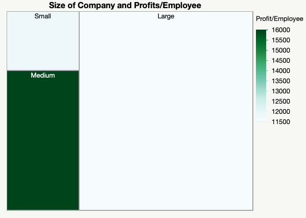 图 1 是一个非常简单的矩形树图,它显示了小型公司、中型公司和大型公司的销售额结构。长方形的大小取决于各类公司的平均销售额(以美元计),颜色取决于每个员工产生的利润。
