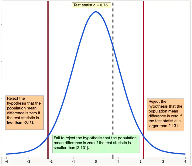 图 5 显示了我们的结果落在图形中的位置。您可以看到,检验统计量 (0.75) 并未足够“远离尾部”,因此无法拒绝平均差异是 0 这个假设。