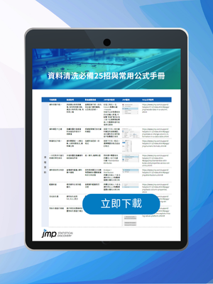 本手冊將為您介紹25種常見的資料問題及對應的解決思路與方案,以及如何在JMP中進行相應操作,更附有JMP公式編輯器中的常用公式,您可以隨時查閱~