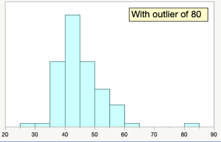 兩組資料的中位數均為 44.6。無離群值的資料的平均數為 45.3,有離群值的資料的平均數為 45.6。兩個直方圖的座標軸尺度都位於 20 至 90 之間。