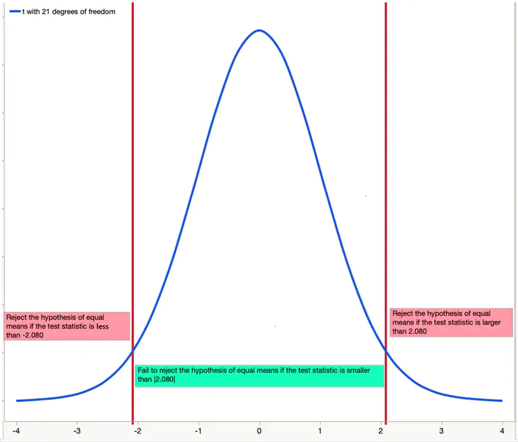 考慮雙尾檢定,平均拆分0.05的α 值,且自由度為 21 的 T 值為± 2.080。比較之後可能產生兩種結果::